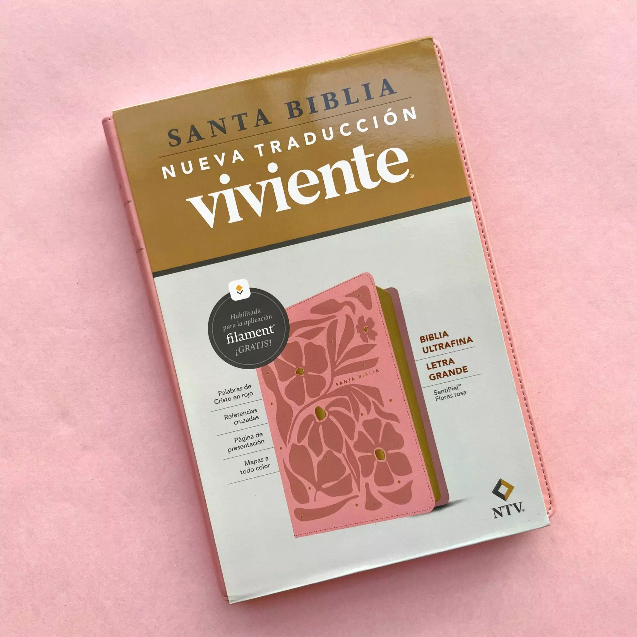La nueva Biblia ultrafina NTV, letra grande con Filament ofrece un texto legible de 10,25 puntos, un diseño atractivo, referencias cruzadas, las palabras de Cristo en rojo, una página de presentación y mapas a todo color: todo en una Biblia delgada y fácil de transportar. La Biblia ultrafina NTV, letra grande ofrece mucho más que una típica Biblia de texto, gracias a la innovadora aplicación «Filament Bible»ue provee una gran cantidad de contenido adicional electrónico relacionado con cada página.
