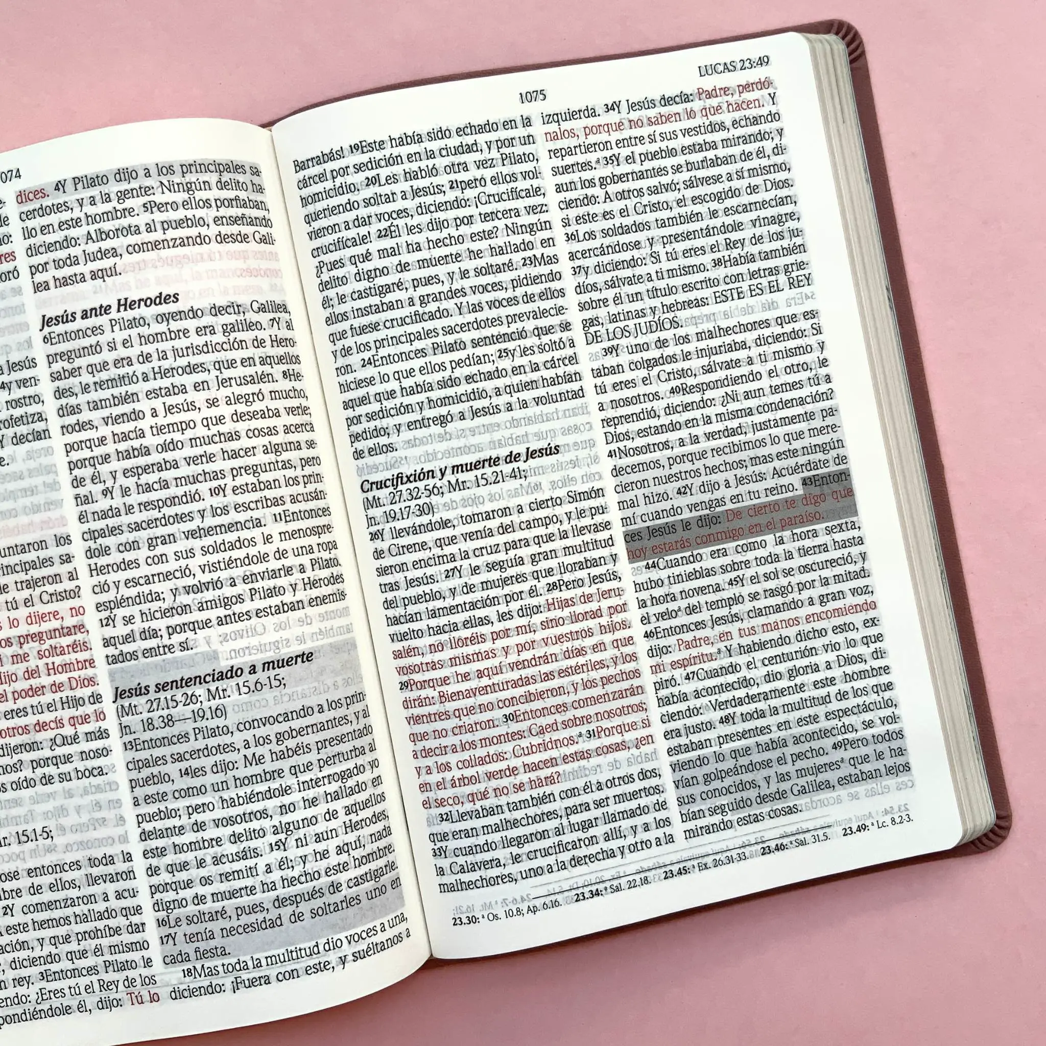 Cuenta con secciones especiales como “Milagros de Jesús”, “Armonía de los Evangelios” y un plan de lectura diaria, pensadas para ayudarte a profundizar en la Palabra. Además, incluye más de 1.800 promesas resaltadas, palabras de Jesús en rojo, concordancia breve e índice de promesas.